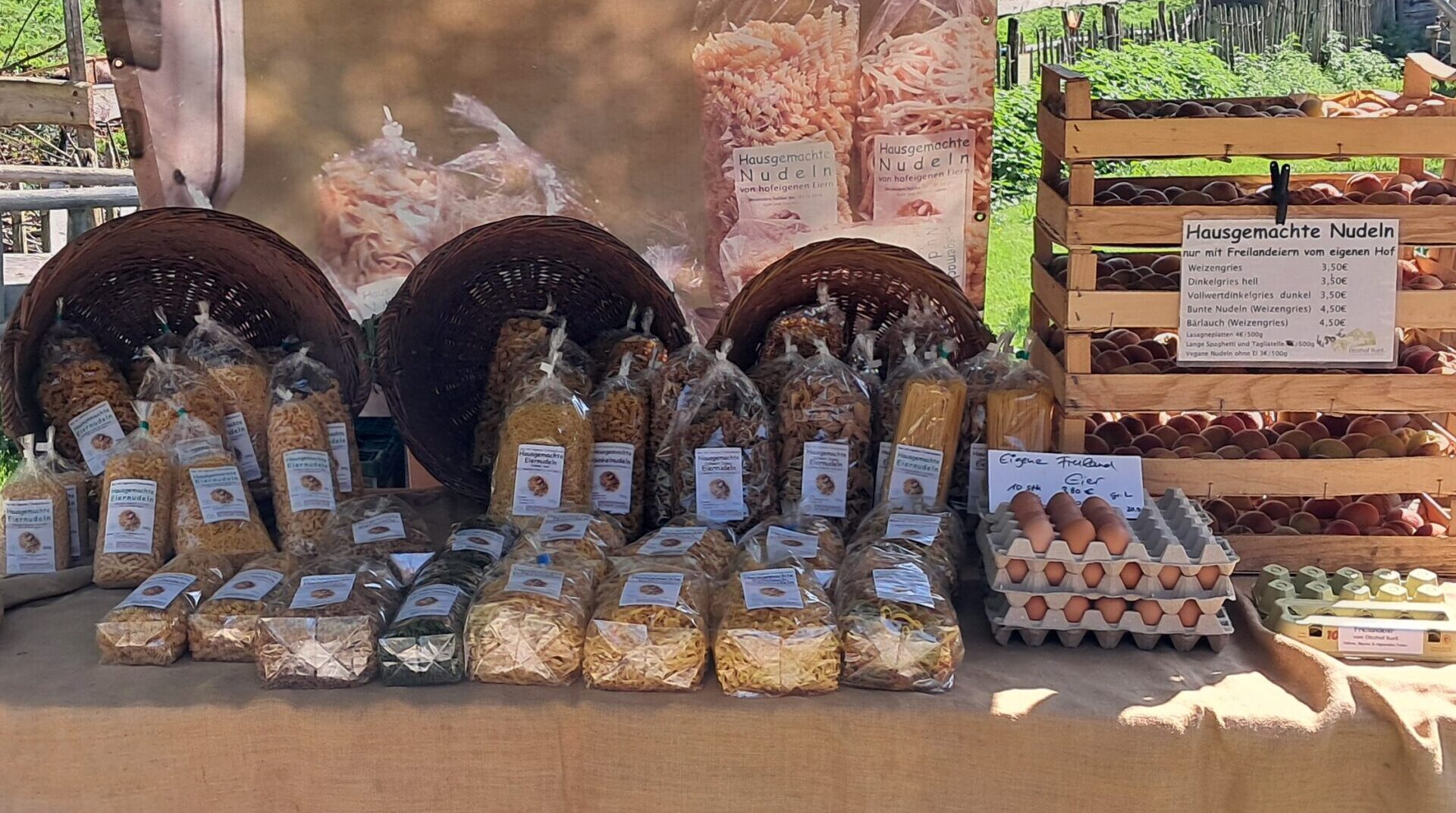 Unser Schwerpunkt ist die hausgemachte Manufaktur von Marmeladen aus den eigenen Früchten und Nudelherstellung mit hofeigenen Freilandeiern